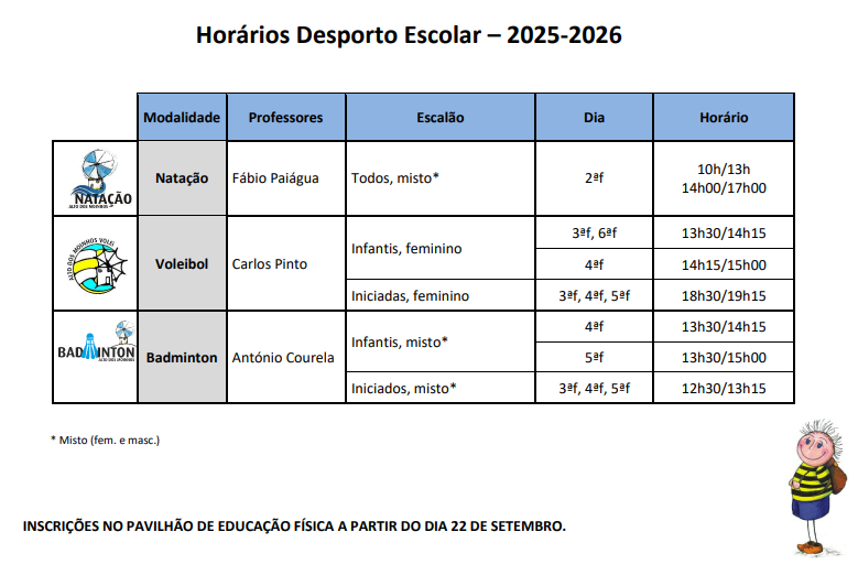 As atividades do Desporto Escolar (DE) e Escola Ativa (EA) terão início na semana de 21 a 26 de setembro, de acordo com os horários afixados.